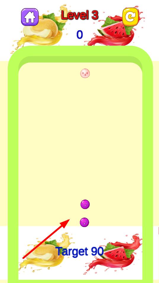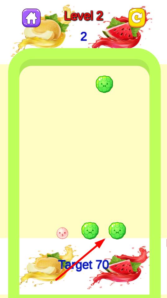 1、基础合并操作:通过拖曳屏幕上相同类型的水果使其靠近合并,合并后水果体积变大且分数增加,优先合并密集区域的相同水果,为后续掉落的水果预留空间,积累基础分数。
