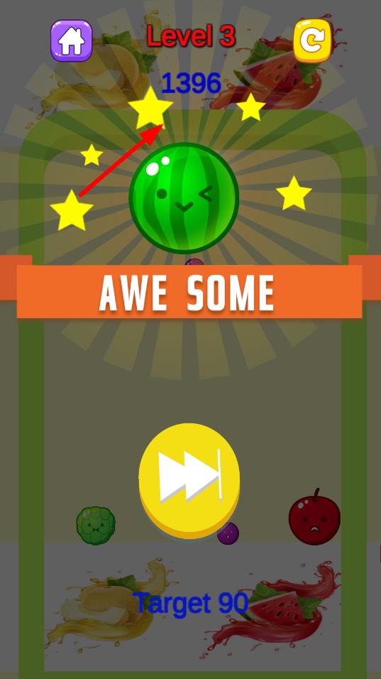 2、沉浸式视听呈现:采用卡通可爱的美术风格,水果造型鲜活灵动,合并时伴有清新特效,搭配轻松明快的背景音乐,从视觉与听觉双重营造愉悦氛围,增强游玩代入感。