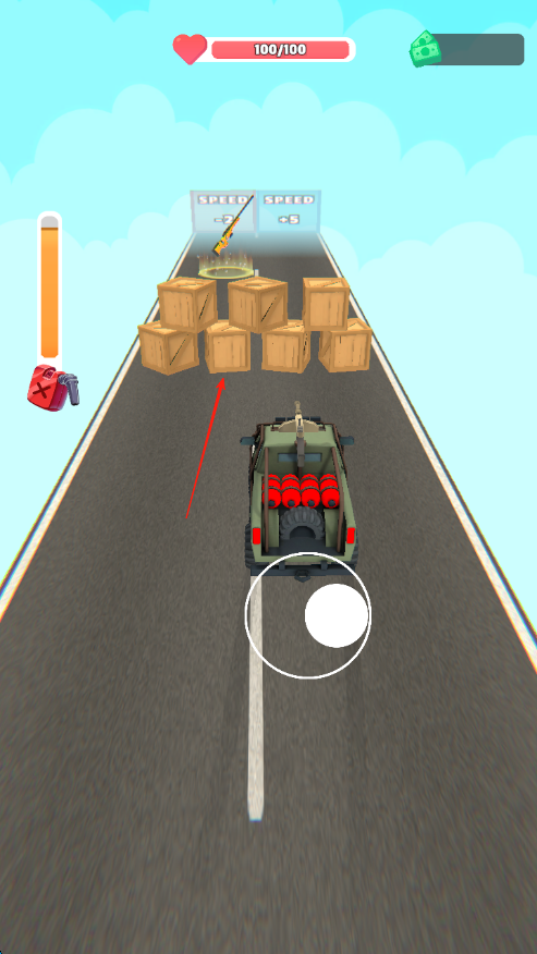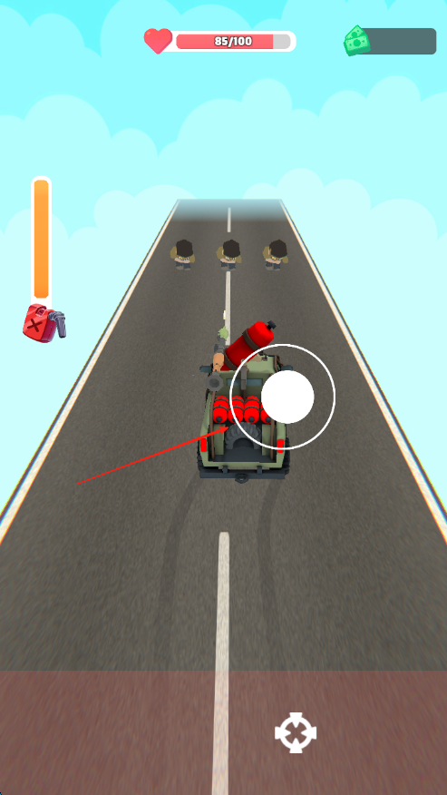 1、进入游戏,留意屏幕上方红心标志的生命值【85/100】,通过屏幕中的虚拟摇杆操控车辆前进。