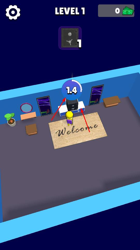 1、LEVEL1中,操控角色移动至目标物品如黑色保险箱处,搬运积累进度,推进关卡。