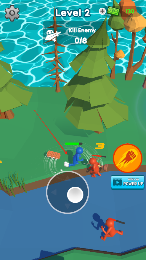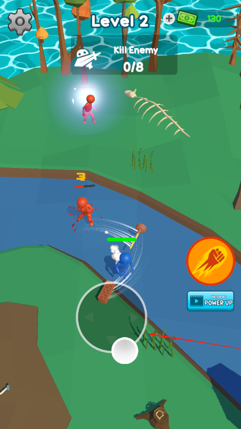 1、在【Level1】关卡,查看任务【KillEnemy0/3】,通过左下角虚拟摇杆操控蓝色角色,靠近红色敌人。