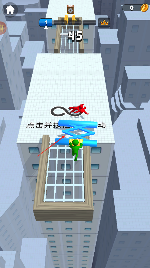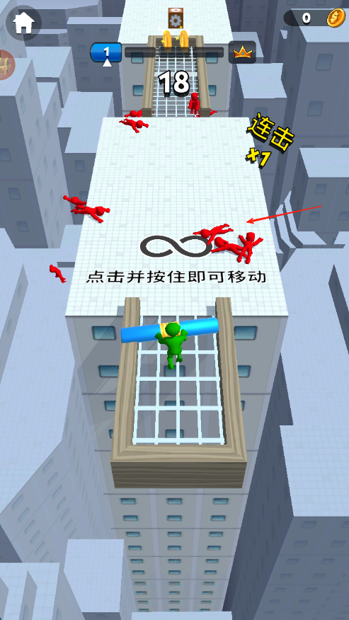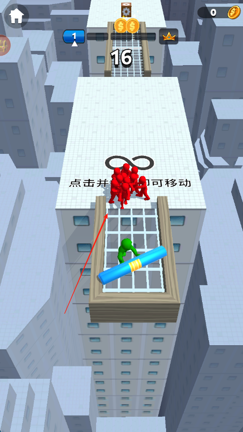 1、进入游戏,看到屏幕上方显示的数字代表关卡进度和分数,操控绿色角色按红箭头方向移动,冲向红色敌人。