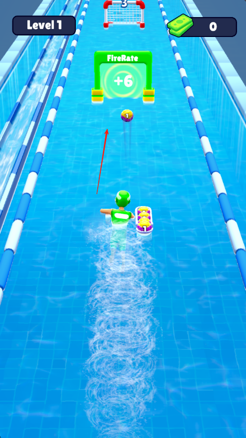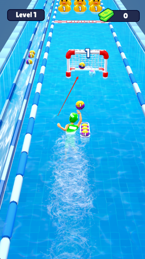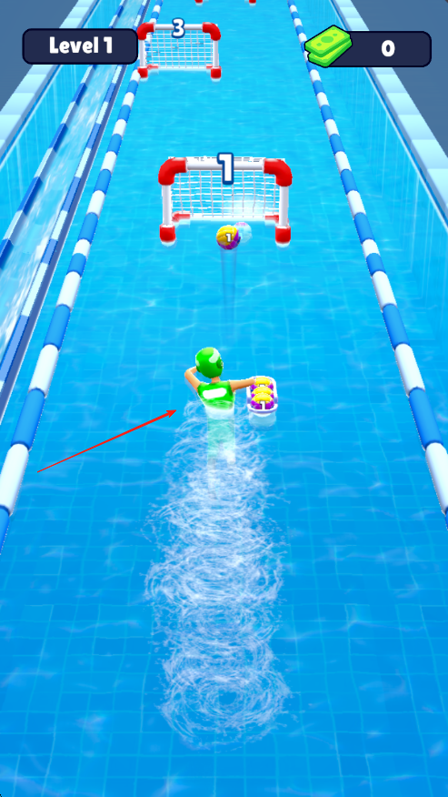 1、在【Level1】关卡,操控角色在泳池赛道前进,收集水球,同时留意前方标有数字的球门。