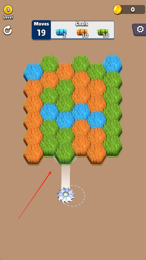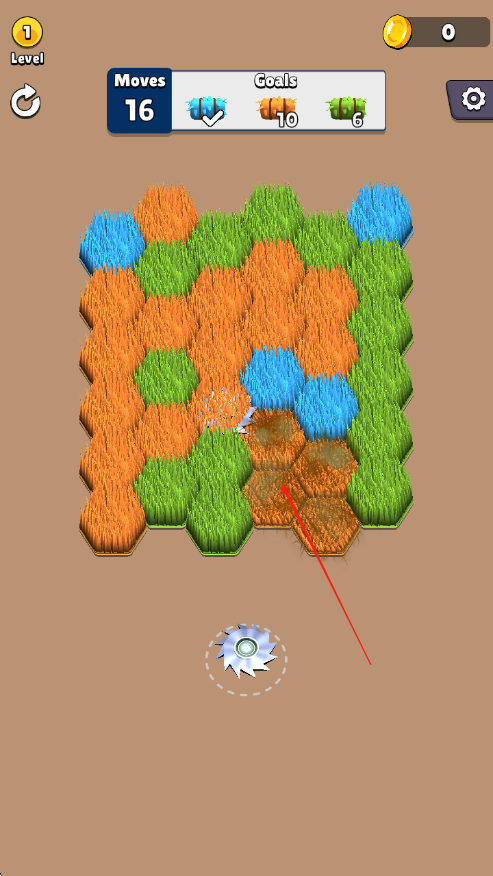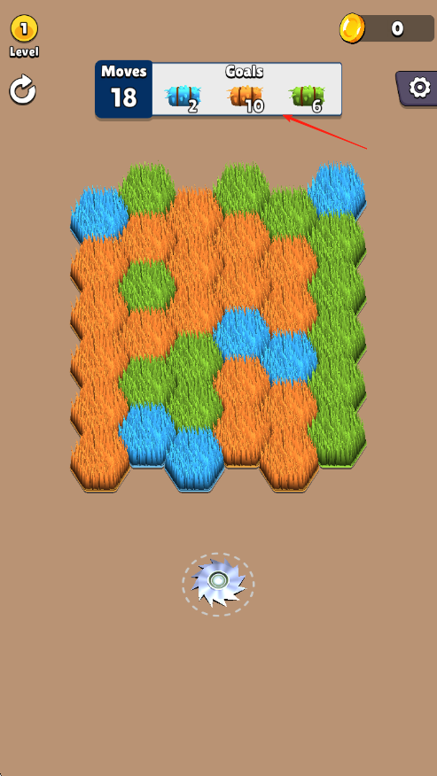2、拖动下方齿轮状道具,按红箭头方向投掷,切割草堆,每切割一次消耗步数,注意收集切割后的目标草堆。