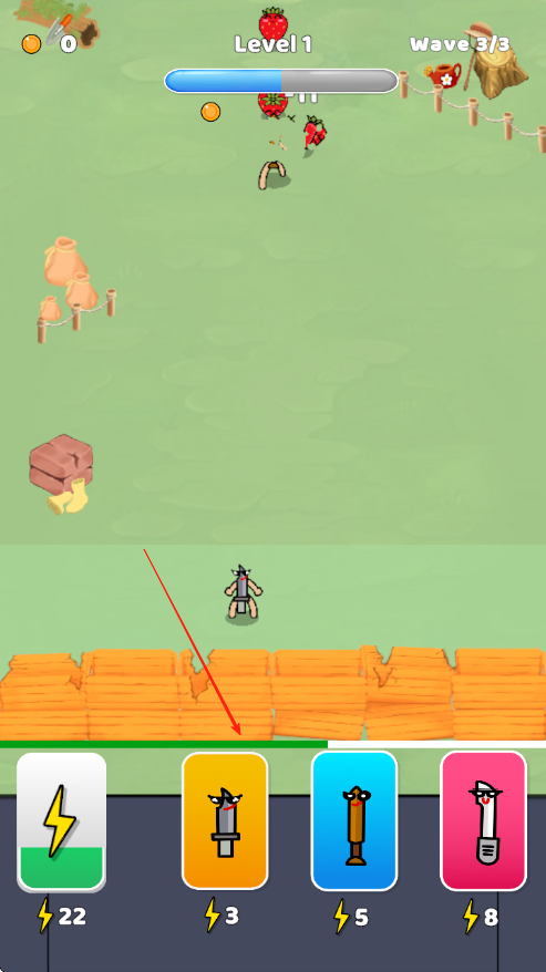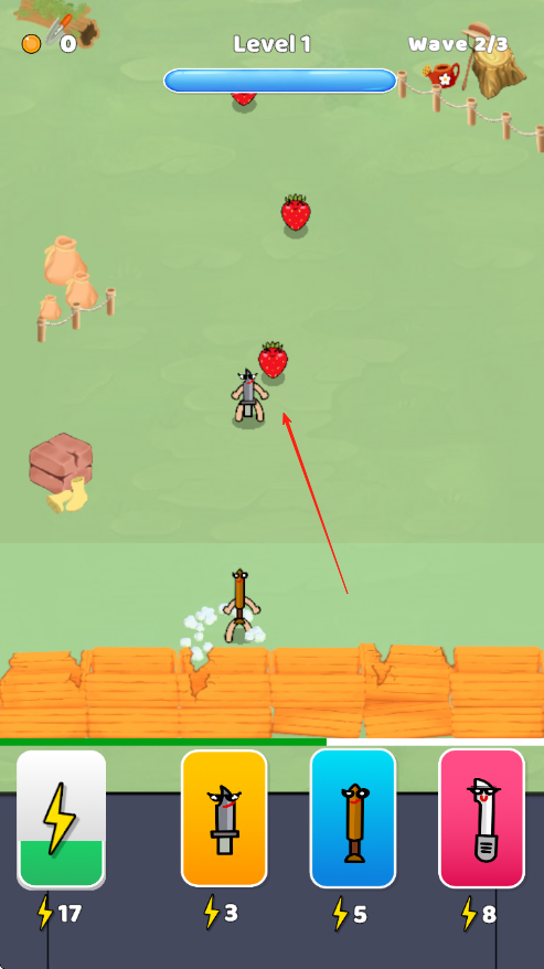1、在【Level1】关卡,查看波次进度【Wave2/3】,操控角色按红箭头方向移动,收集途中的草莓。