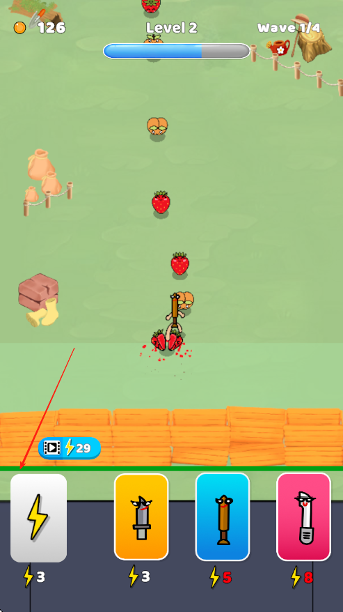 2、技能搭配策略:将基础攻击与特殊技能组合使用,如先用击退技能将水果聚集,再释放范围攻击造成群体伤害,针对不同水果组合灵活切换技能搭配。