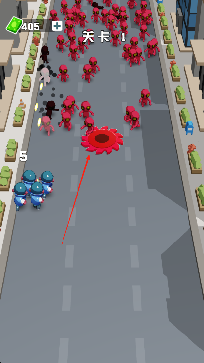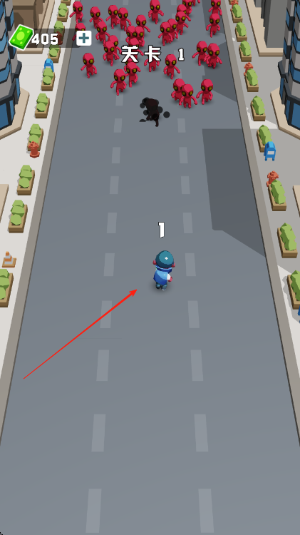 1、进入【关卡1】,操控蓝色角色向前移动红箭头所指方向,留意屏幕左上角的金钱数量初始【405】。