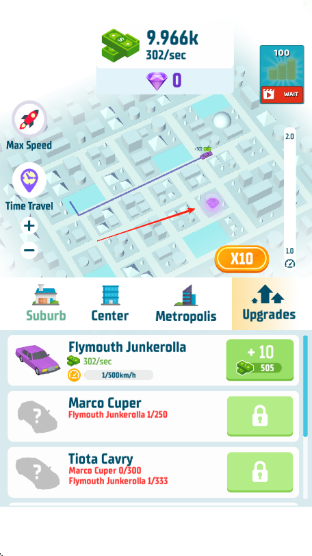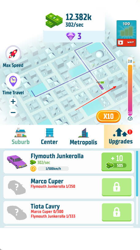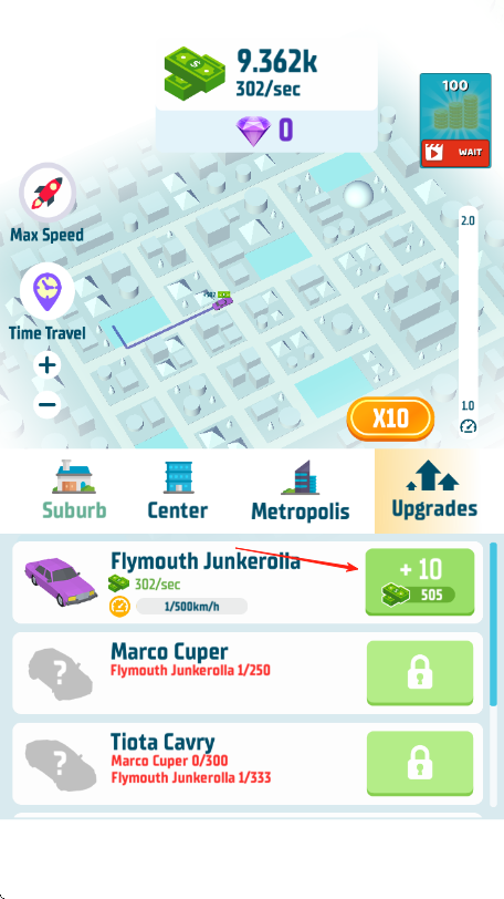 1、进入游戏,查看屏幕上方的金钱数量,点击【Flymouth Junkerolla】右侧的【+10】按钮,花费【505】金钱升级汽车,提升每秒收益。
