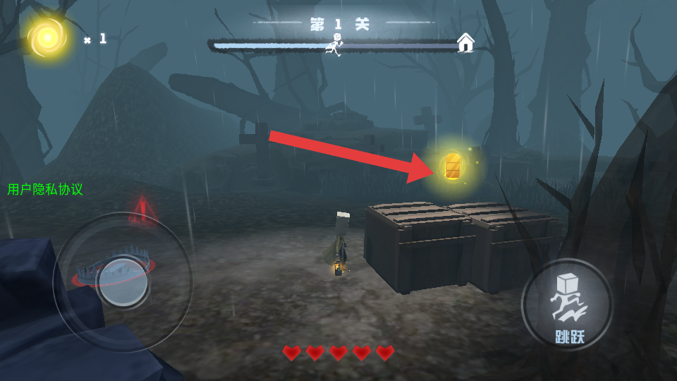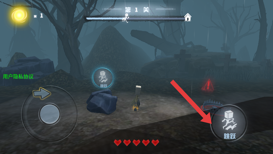 1、进入第1关,用左侧虚拟摇杆控制角色移动,遇到红色警示物如地刺转向躲避;看见能量道具优先收集。