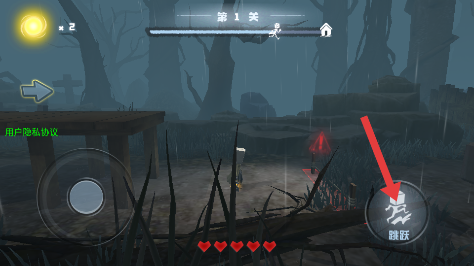 2、遇障碍如木箱、沟壑时,点击右侧跳跃按钮翻越,注意把握跳跃时机提前按避免坠崖,过桥木桥场景。