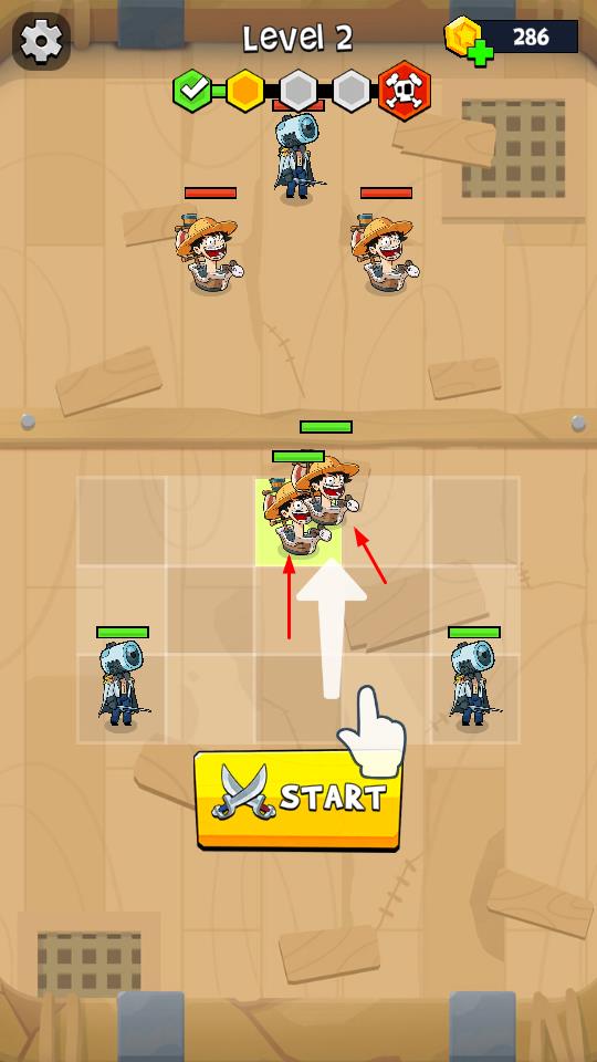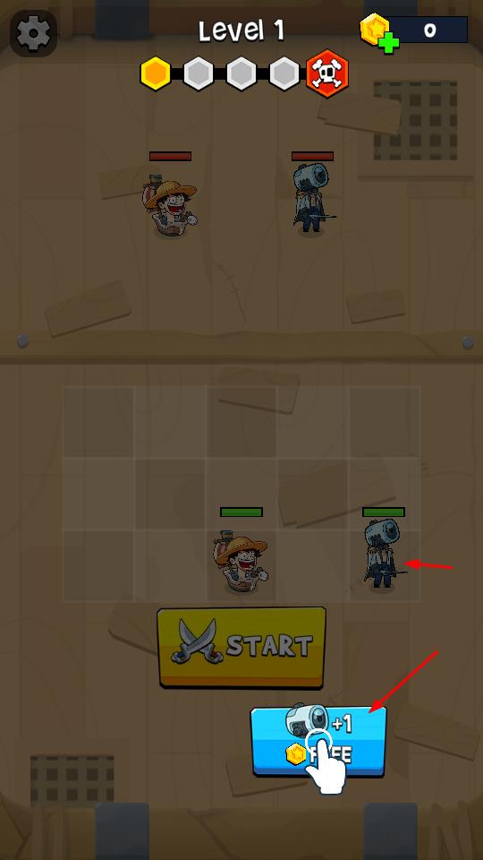 1、在网格部署英雄,点击START开启关卡战斗,对抗上方敌人。