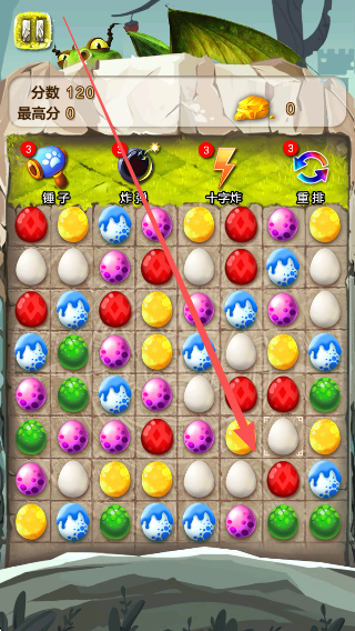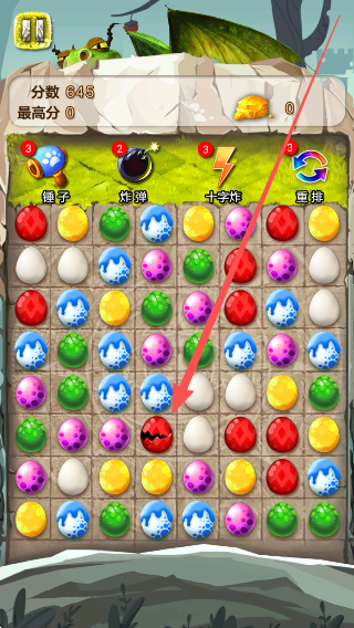 1、在蛋形网格中,连接三个同样颜色的蛋可以进行消除,不断积累分数,解锁道具。