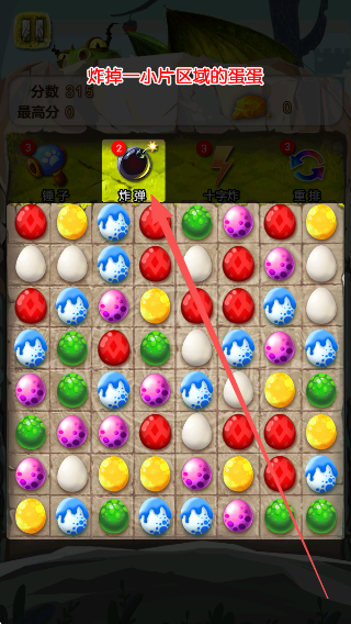 2、选择上面四种道具,点击炸弹,选定区域,执行炸掉一小片区域的蛋蛋操作。