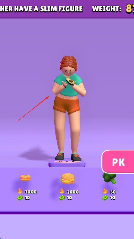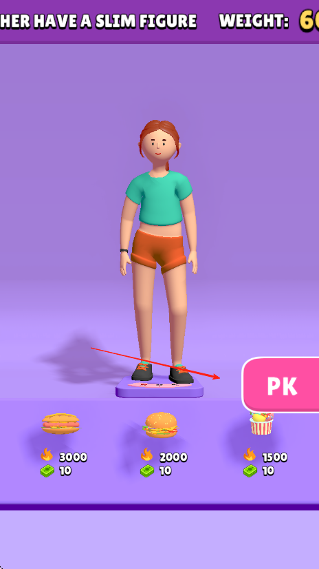 3、当人物体重达到理想状态,点击右侧PK按钮,参与身材比拼,和对手较量,依据体重及身材完成关卡挑战。