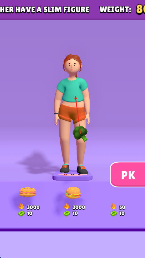 1、人物站在秤上,下方有不同食物,点击西兰花等健康食物,拖拽给人物吃,可降低体重,选汉堡等,会增加体重,按需投喂调整身材。
