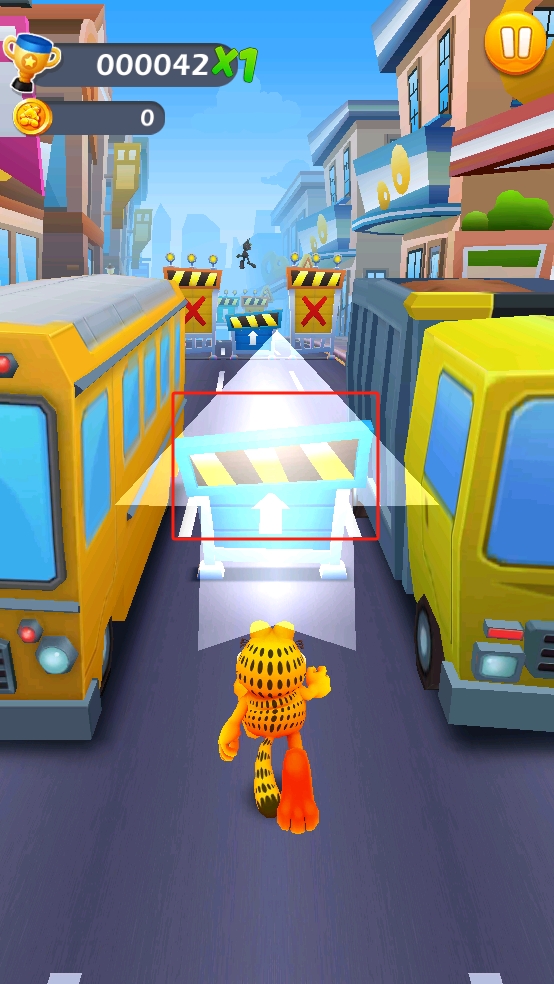 1、遇到道路障碍,根据提示快速上滑屏幕,控制加菲猫跳跃躲避,提前规划路线,别因碰撞中断奔跑。