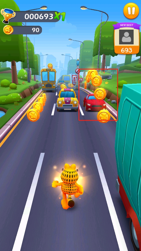 1、基础跑酷操作:通过上下滑动屏幕即可控制加菲猫跳跃过障碍,滑行钻过低空,左右滑动切换跑道,在保证不摔倒的同时,尽可能多捡金币,提升得分。