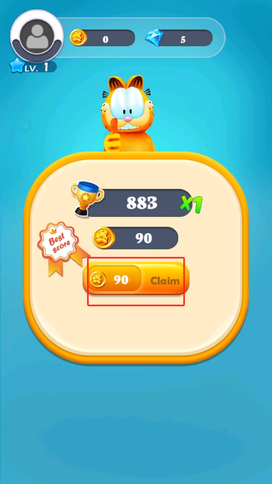 3、关卡结束后,点击Claim按钮领取90金币的奖励,积累的金币可解锁角色皮肤、道具,助力后续更高难度跑酷。