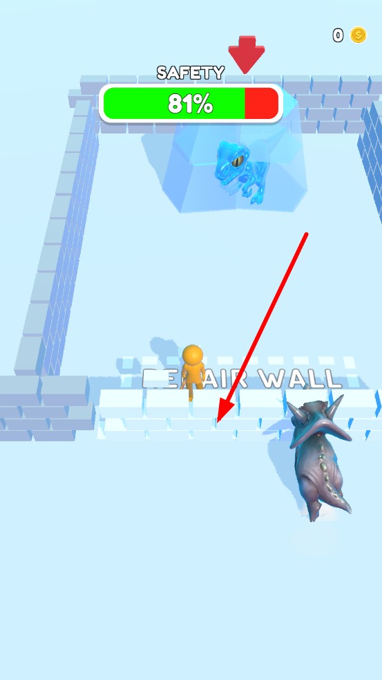 1、开局观察冰墙内冰封恐龙与外围怪物分布,点击角色移动,靠近冰墙触发解冻,绕行躲避怪物攻击。