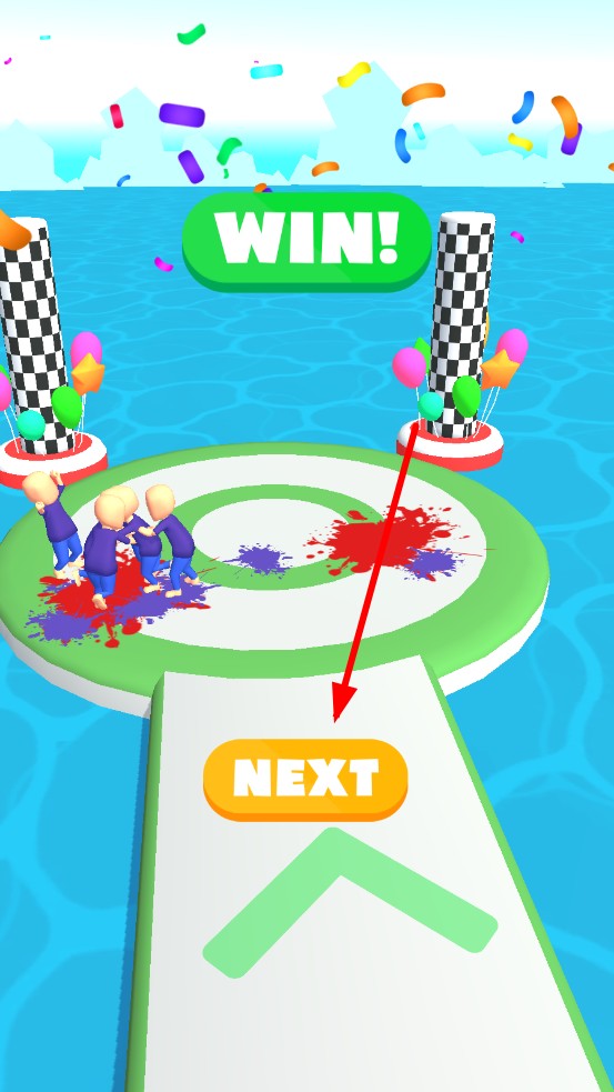 3、抵达终点平台后,指挥蓝色军团围攻红色守卫,人数占优后将其击溃;画面弹出WIN!,点击NEXT进入下一关,解锁更复杂地形挑战。