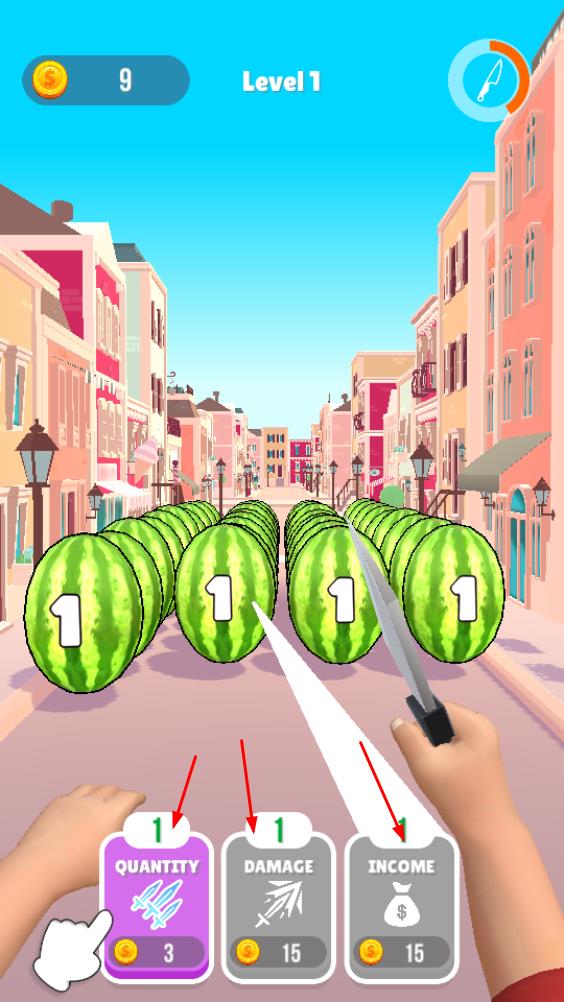 1、操控刀具砍击前方标数西瓜,获取金币,开启关卡挑战进程。