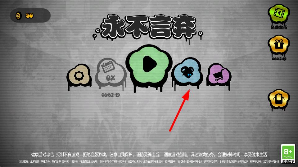 1、打开永不言弃游戏进入主界面,左上角可看到游戏币数量,点击主界面中绿色播放图标右侧蓝色图案按钮。