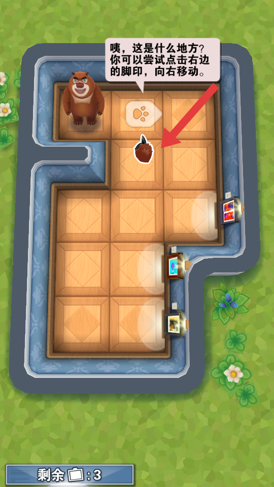 1、进入游戏界面后,跟随熊大指引,点击右侧脚印图标移动,熟悉房间探索基础操作,这是流程的关键。
