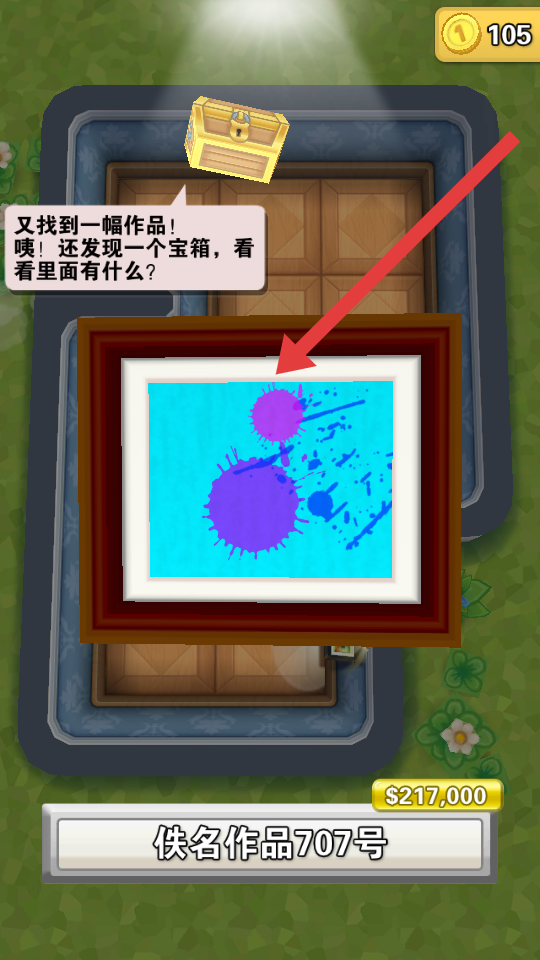 3、持续探索未解锁区域剩余3格提示,收集佚名作品707号等藏品,点击宝箱开启奖励,利用金币升级功能。