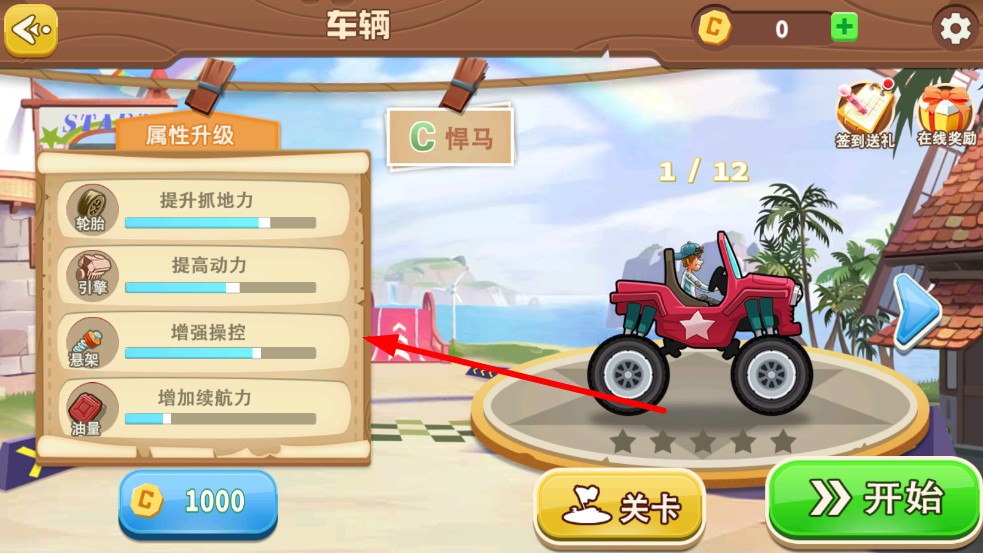1、进入车库选初始车辆,消耗金币升级轮胎抓地力、引擎动力、悬架操控、油量续航,定制车辆性能,点击开始进入赛道。