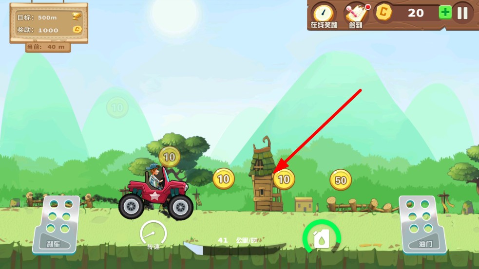 2、赛道内用油门加速、刹车减速,通过转速表,掌控汽车的速度,收集路边金币,关注油量消耗,遇到汽油箱一定要收集。