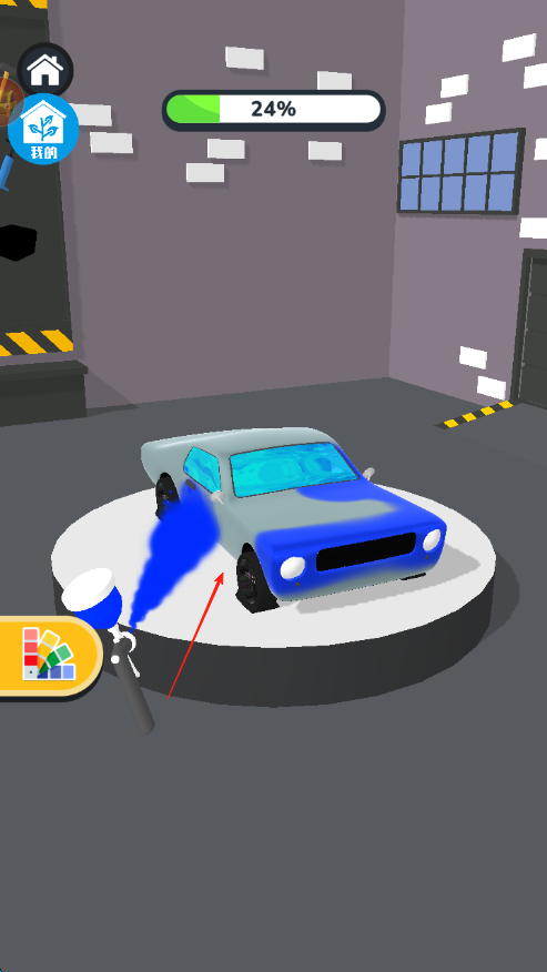 2、点击并按住喷漆按钮,对汽车进行喷涂,屏幕上方进度条显示喷涂完成度,持续操作直至完成车身涂鸦。