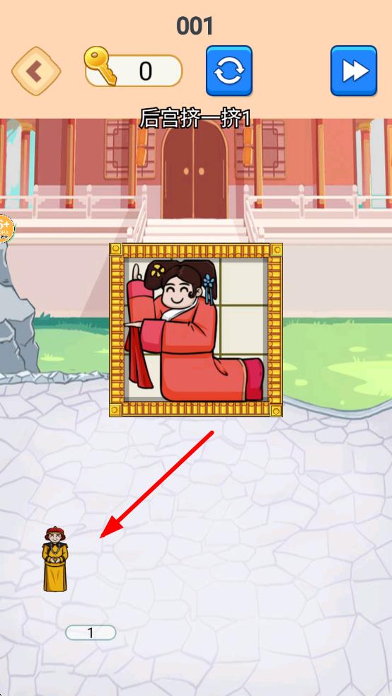 3、在后宫挤一挤1关卡,观察方格内红衣角色与下方黄衣角色,通过移动操作让角色归位,利用界面功能按钮助力通关。