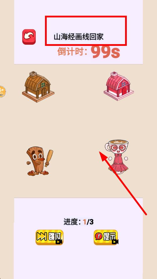 2、进入山海经画线回家关卡后,留意99秒倒计时,观察角色与房屋,按指引为角色规划路线,让其回到对应房屋。