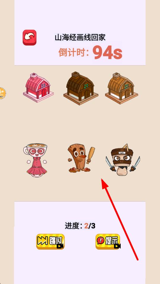 3、继续山海经画线回家关卡,此时倒计时94秒,新增角色与房屋,依据布局为角色规划合理路线,使角色归位,完成阶段目标。
