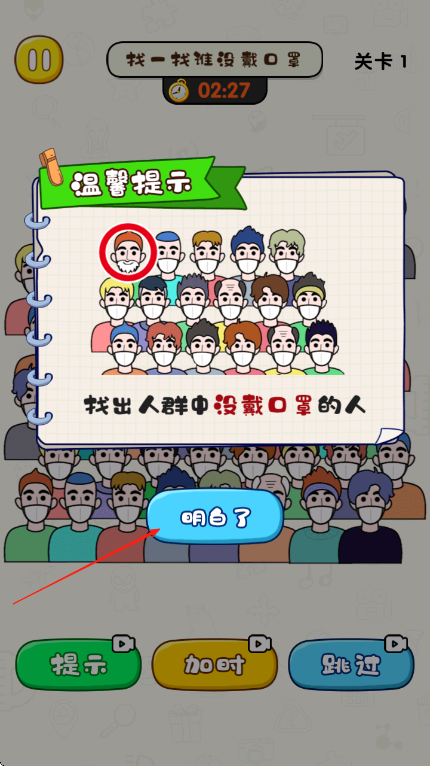 1、在关卡1中,查看上方任务【找一找谁没戴口罩】明确目标,点击【明白了】进入,在规定时间内找出没戴口罩的人。