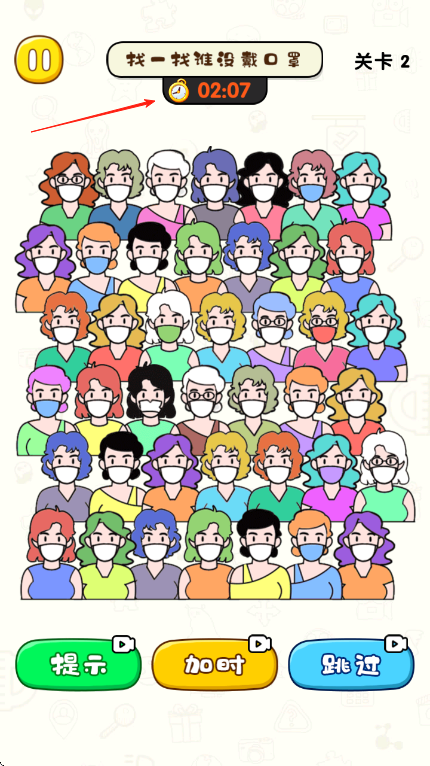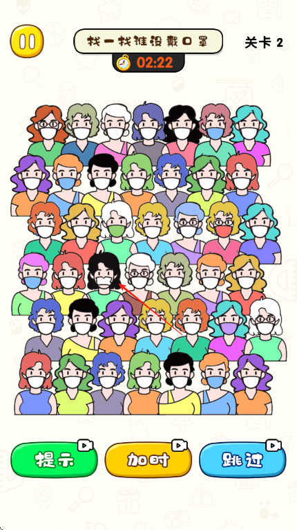 2、进入关卡2,面对更复杂人群,仔细观察人物面部,按红箭头指示方向快速定位没戴口罩的人,点击选中。