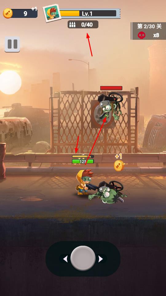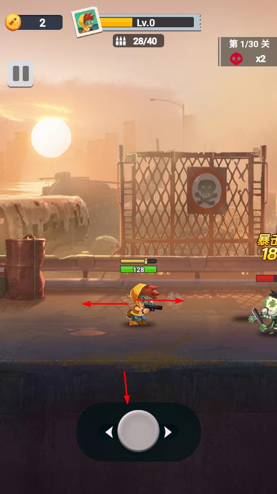 1、滑动下方摇杆操控角色移动,调整站位瞄准僵尸,开启射击进程。