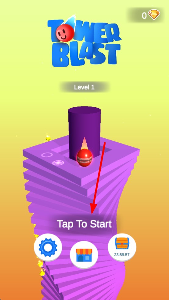 1、启动界面点击Tap To Start,红球被底部火焰弹出,沿螺旋塔开始坠落。塔层呈紫色螺旋堆叠,红球砸中即粉碎一层。