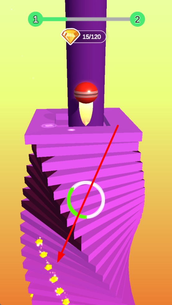 3、宝石收割细节:下落时紧盯黄色宝石轨迹,轻微左右滑动调整红球路径,别幅度过大,易偏离主塔,确保经过宝石密集区;遇到分散宝石,优先收高价值的钻石宝石。