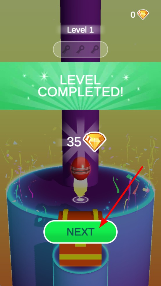 3、红球抵达塔底后,屏幕弹出LEVEL COMPLETED,收获钻石奖励;点击NEXT进入新关,后续塔层螺旋更扭曲,挑战逐步升级。