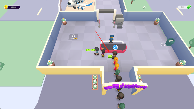 1、进入游戏,操控角色引导旅客按红箭头方向排队,依次通过安检,留意地面上的绿色金钱道具,收集增加游戏货币。