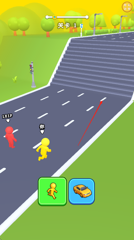1、在关卡1中,操控黄色小人按红箭头方向在道路上奔跑,留意前方的红色小人对手。