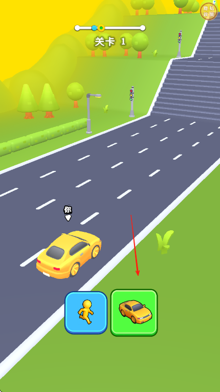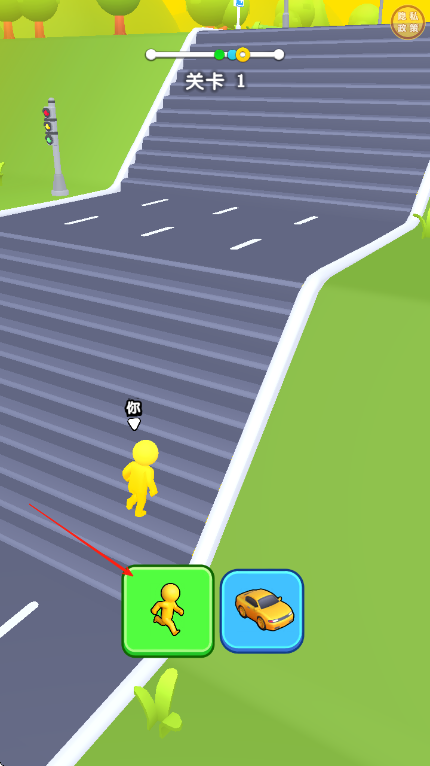 2、当接近楼梯等地形时,点击屏幕下方的汽车图标,让小人变身为汽车形态,快速通过长距离路段。