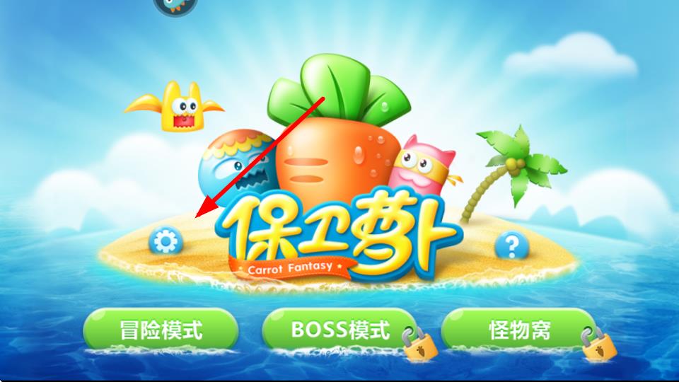 1、打开保卫萝卜,在游戏主界面中,找到并点击如图中所示设置图标,进入设置相关界面。