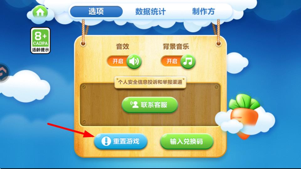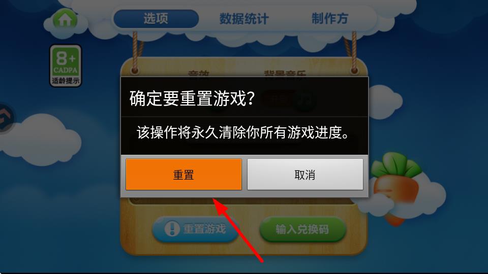 2、进入设置界面后在选项栏下可以看到重置游戏按钮-点击此按钮。要留意该操作不可逆-将清除游戏进度。