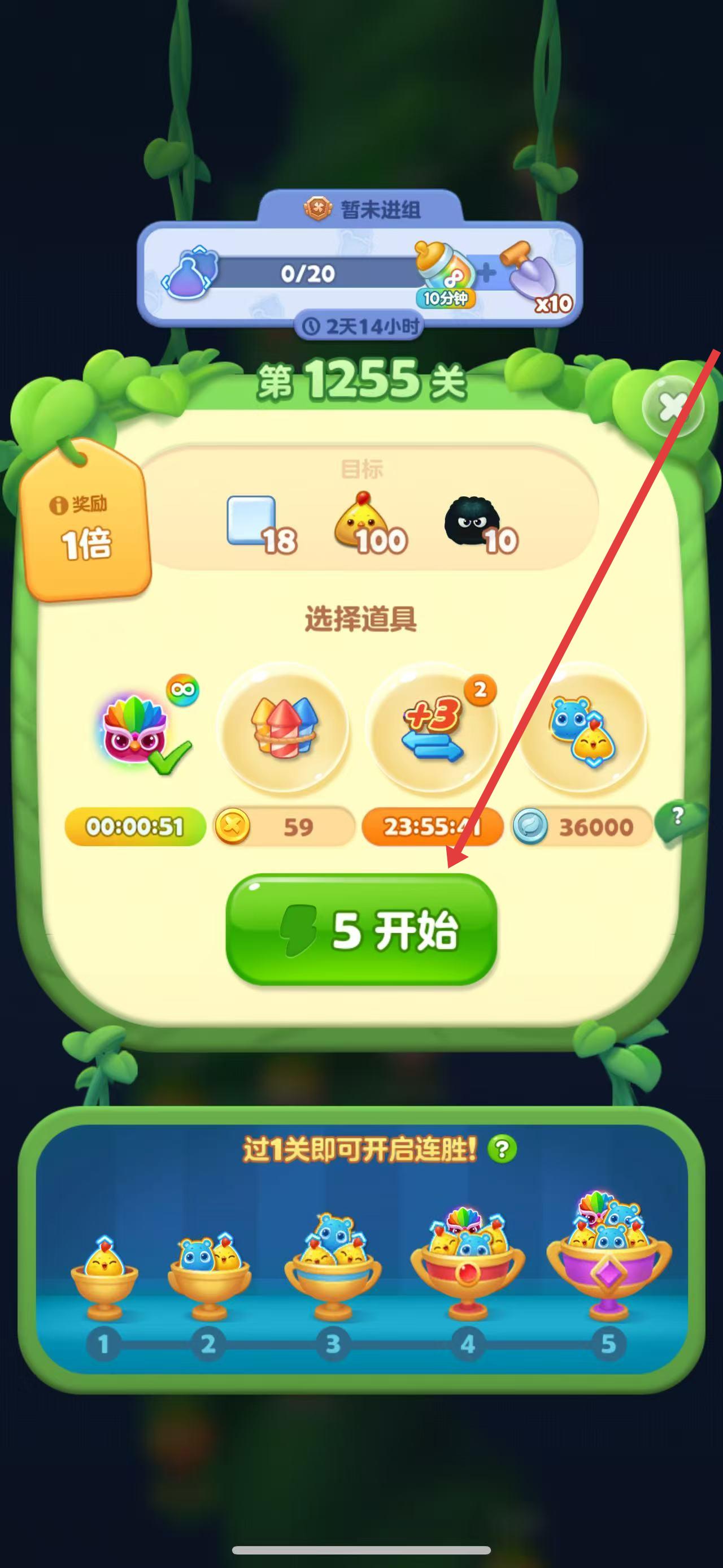 1、打开开心消消乐,进入关卡准备页面,点击开始按钮开启游戏并努力通关。