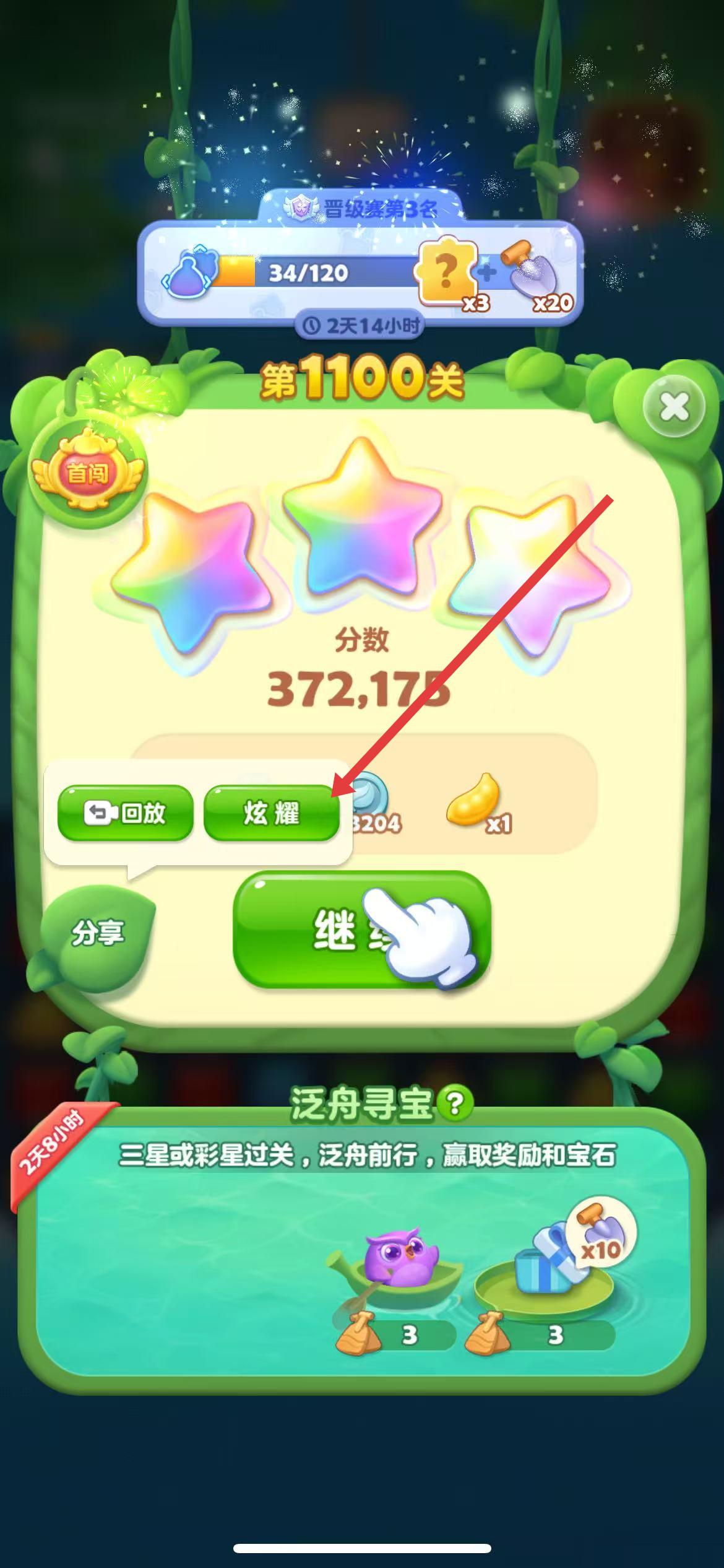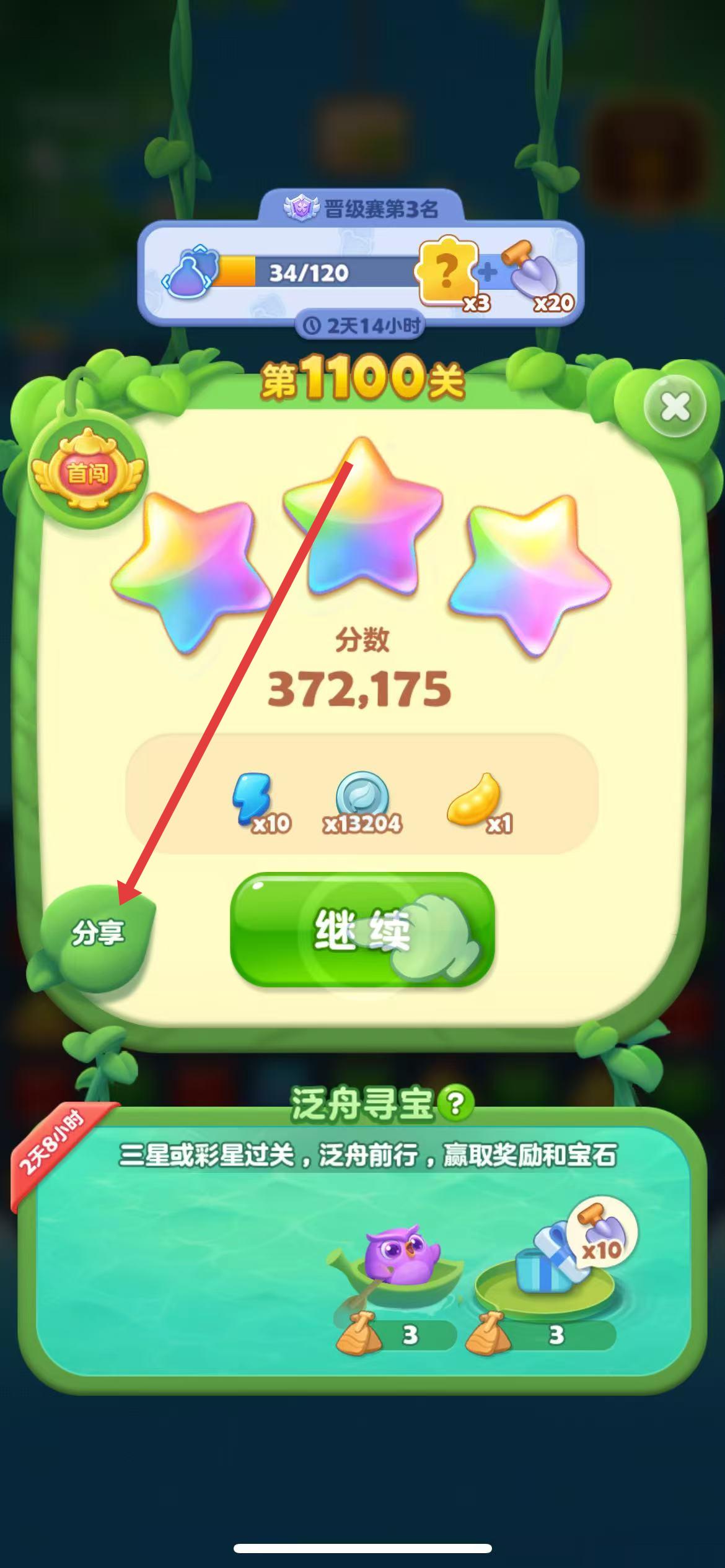 2、成功通过关卡后,在过关结算界面中,点击左下角的分享按钮进入分享流程。