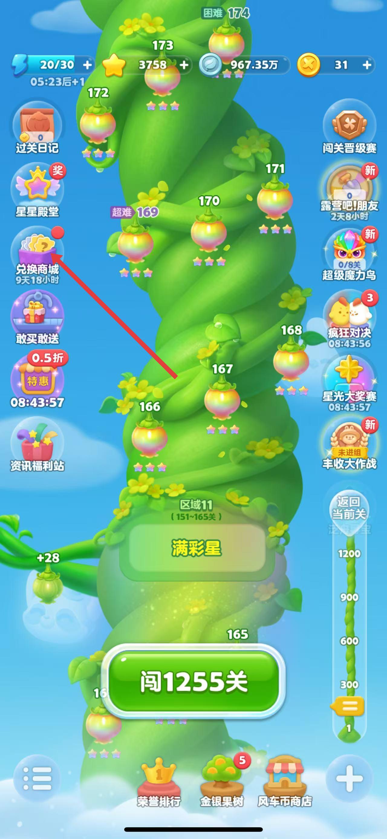 1、打开开心消消乐游戏,点击主界面左侧的兑换商城图标,进入兑换商城页面。