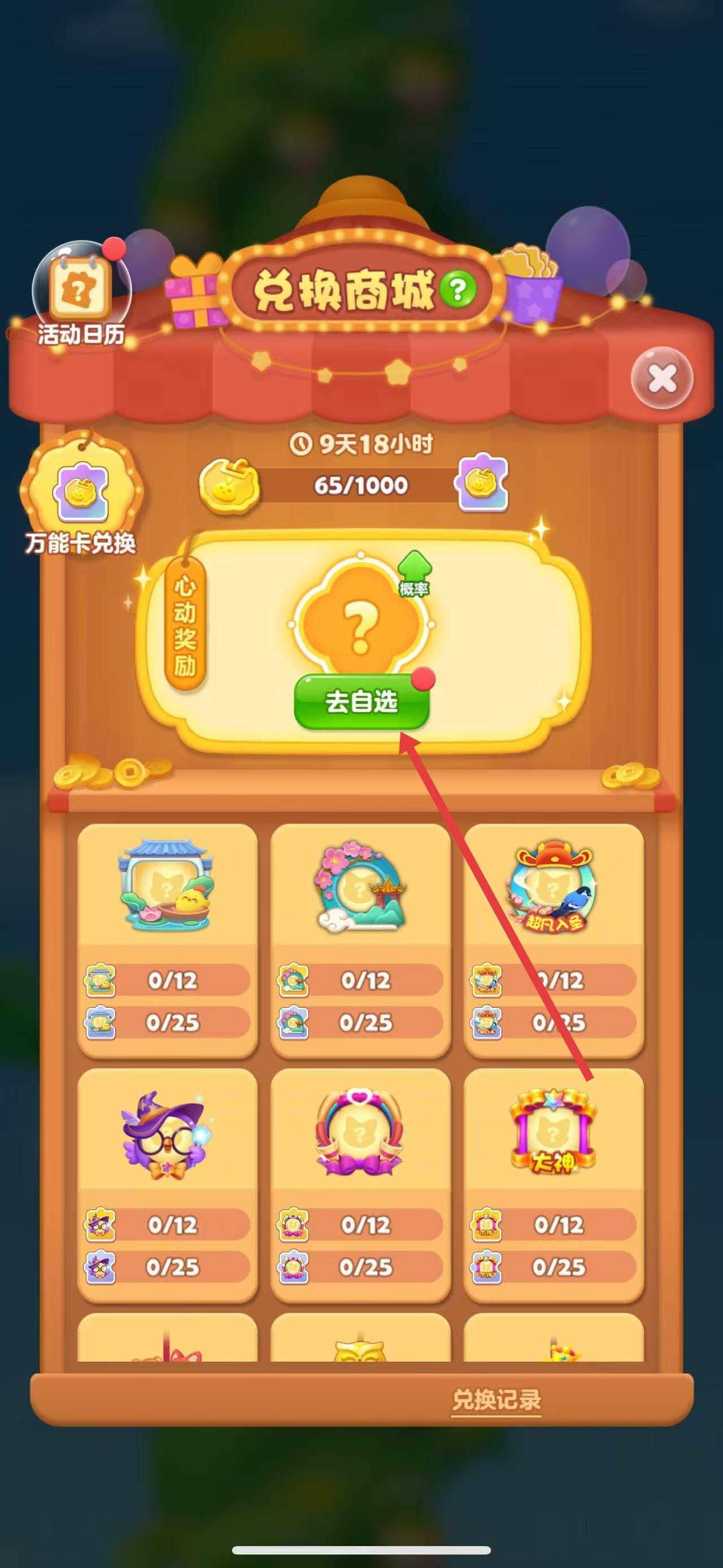 2、在兑换商城页面中,找到并点击去自选按钮,进入心动奖励选择界面。