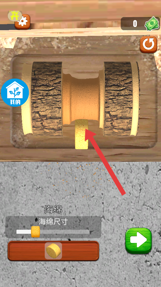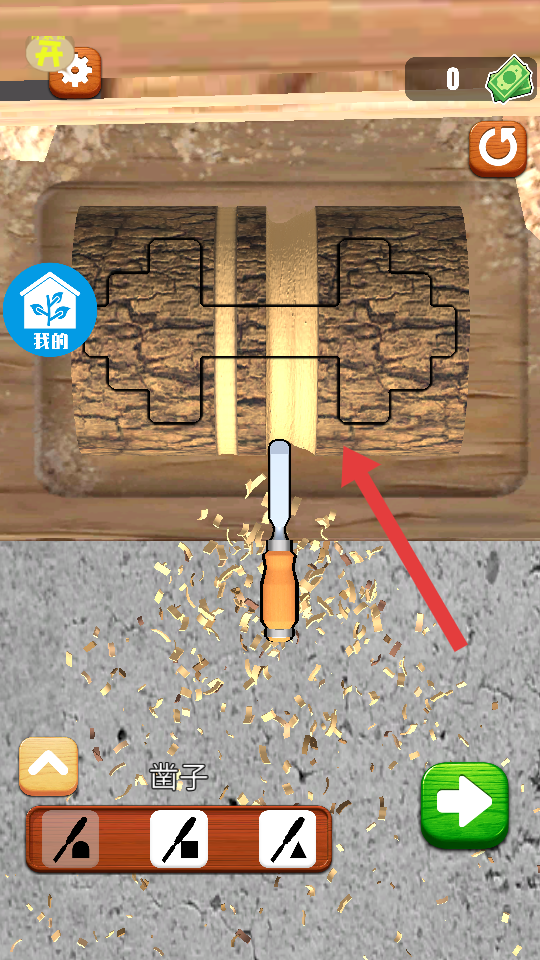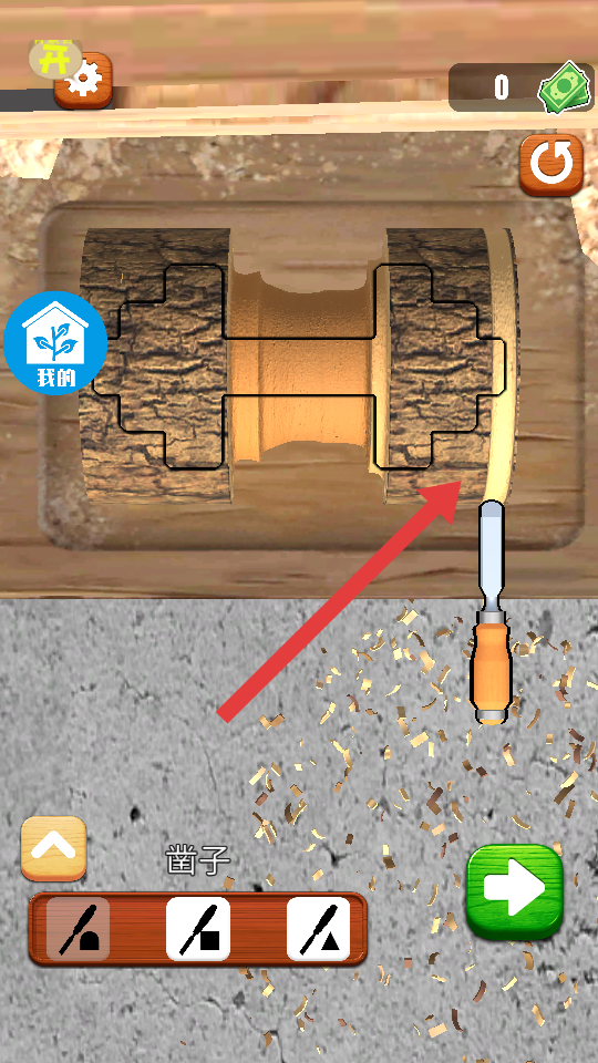1、进入关卡后,点击下方工具栏,挑选与木料轮廓适配凿子工具,沿着表面的黑色的轮廓线移动。